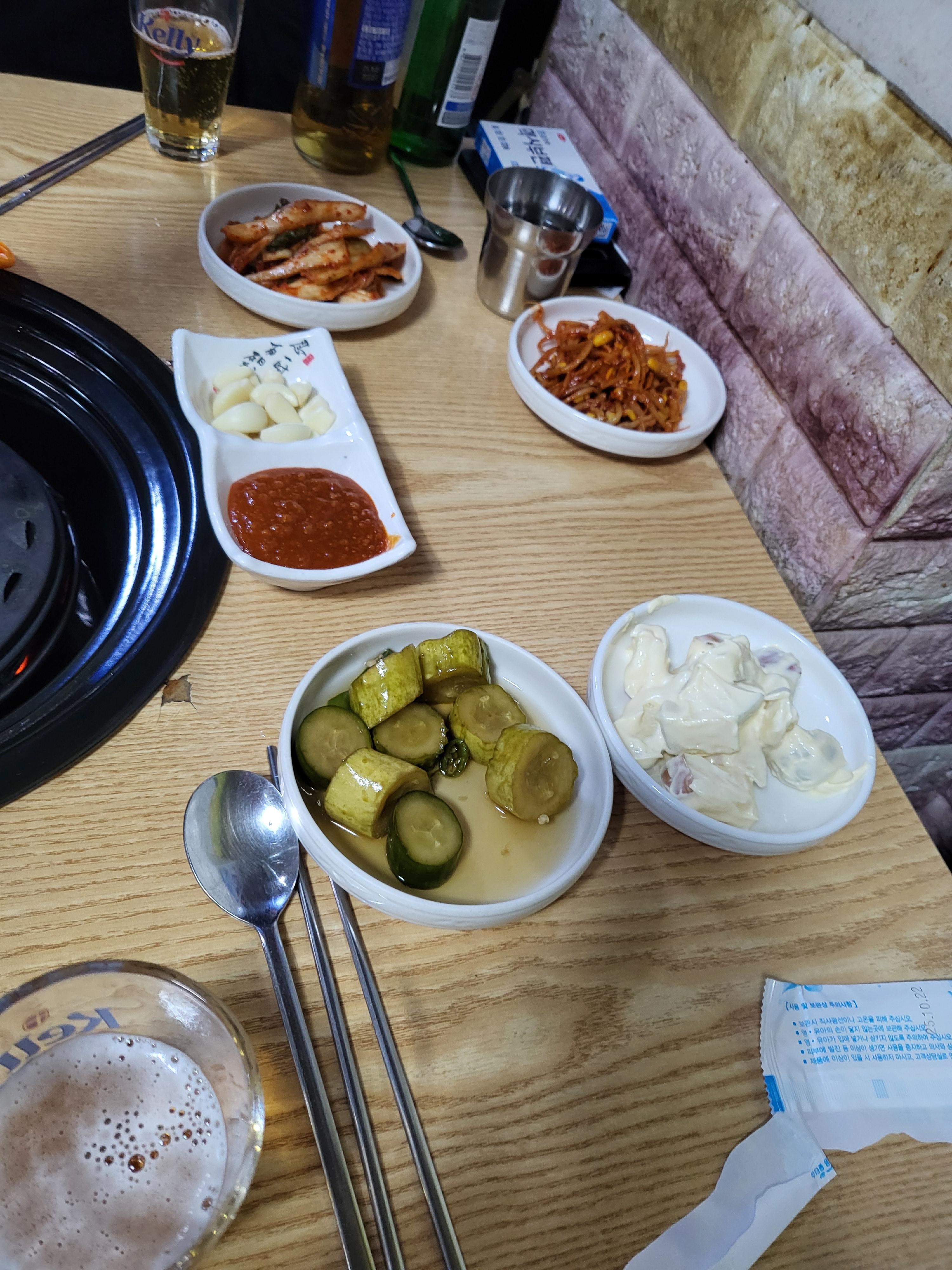 반찬은 피클, 사라다, 마늘, 쌈장, 계란찜, 김치, 콩나물