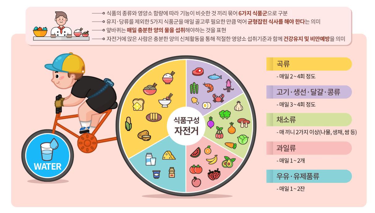 식품구성자전거는 매일 다섯가지 식품군과 물을 골고루 적정량 섭취하도록 만들어진 영양가이드 라인