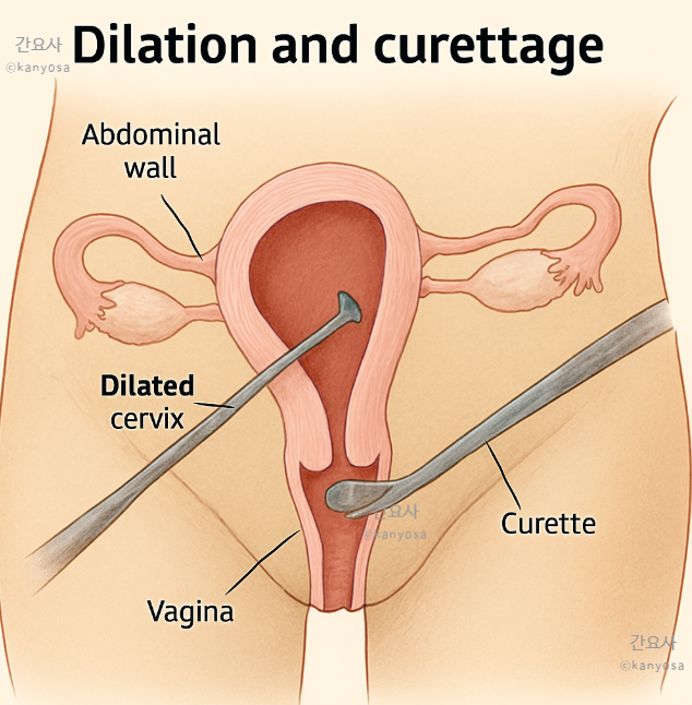 ②큐렛(curette)을 사용해 자궁 내벽을 긁어냄,