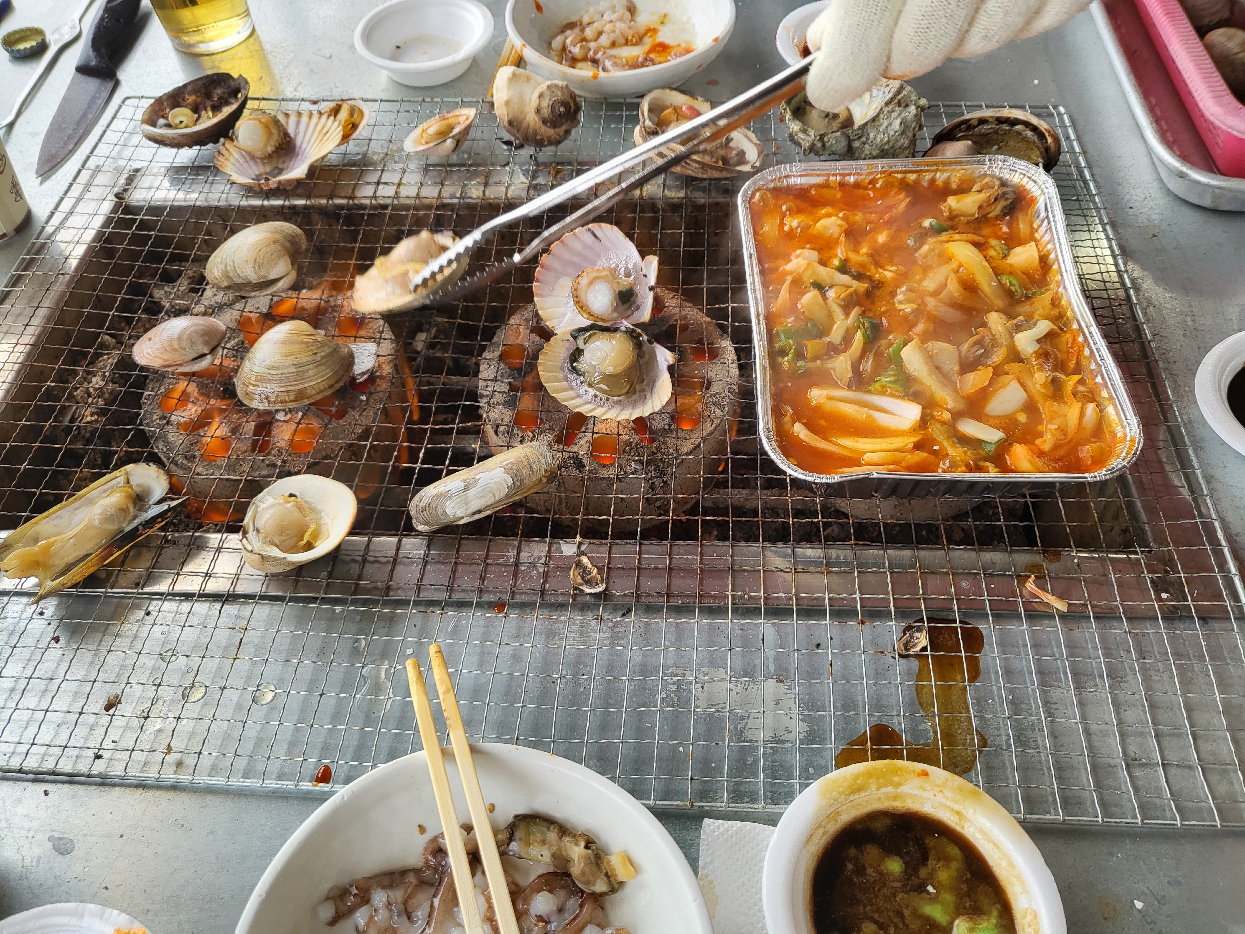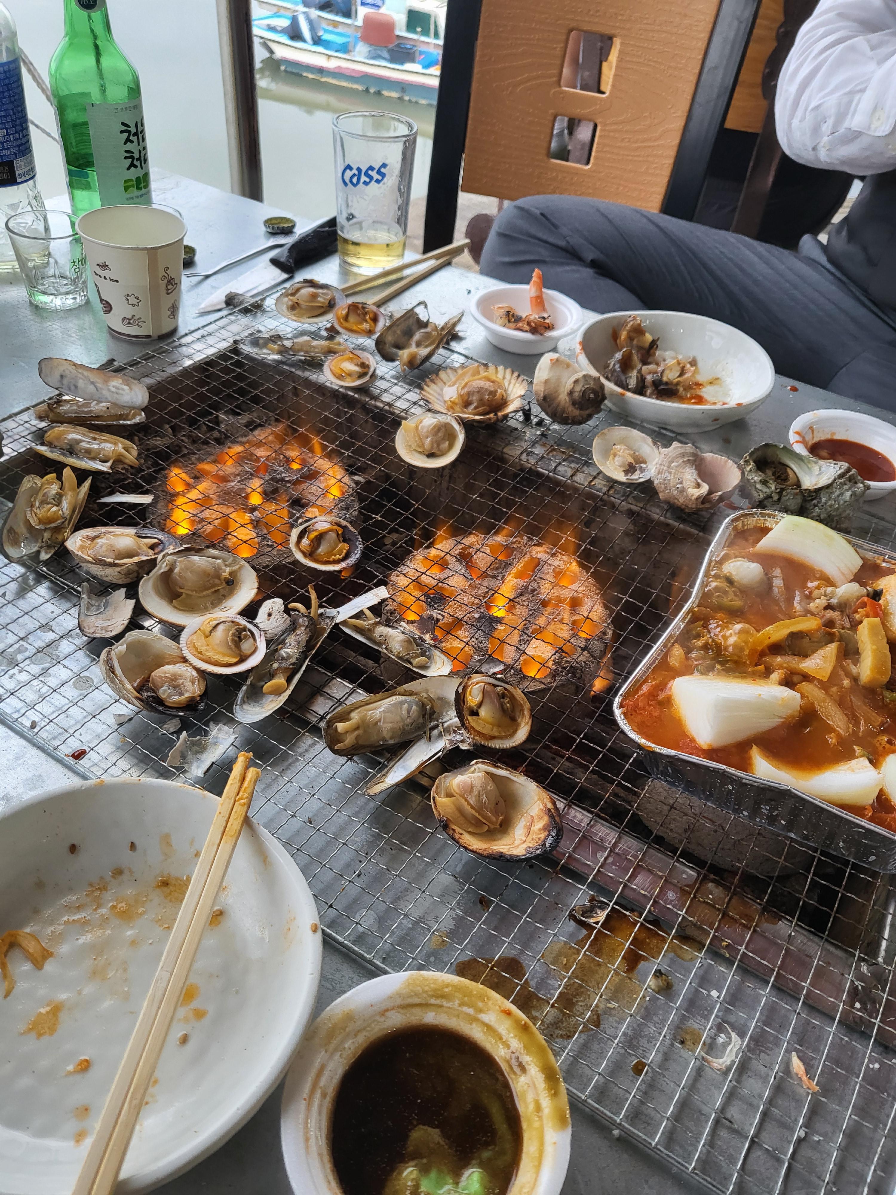 번개탄에 먹는 조개구이 + 술 + 바닷가 바로앞