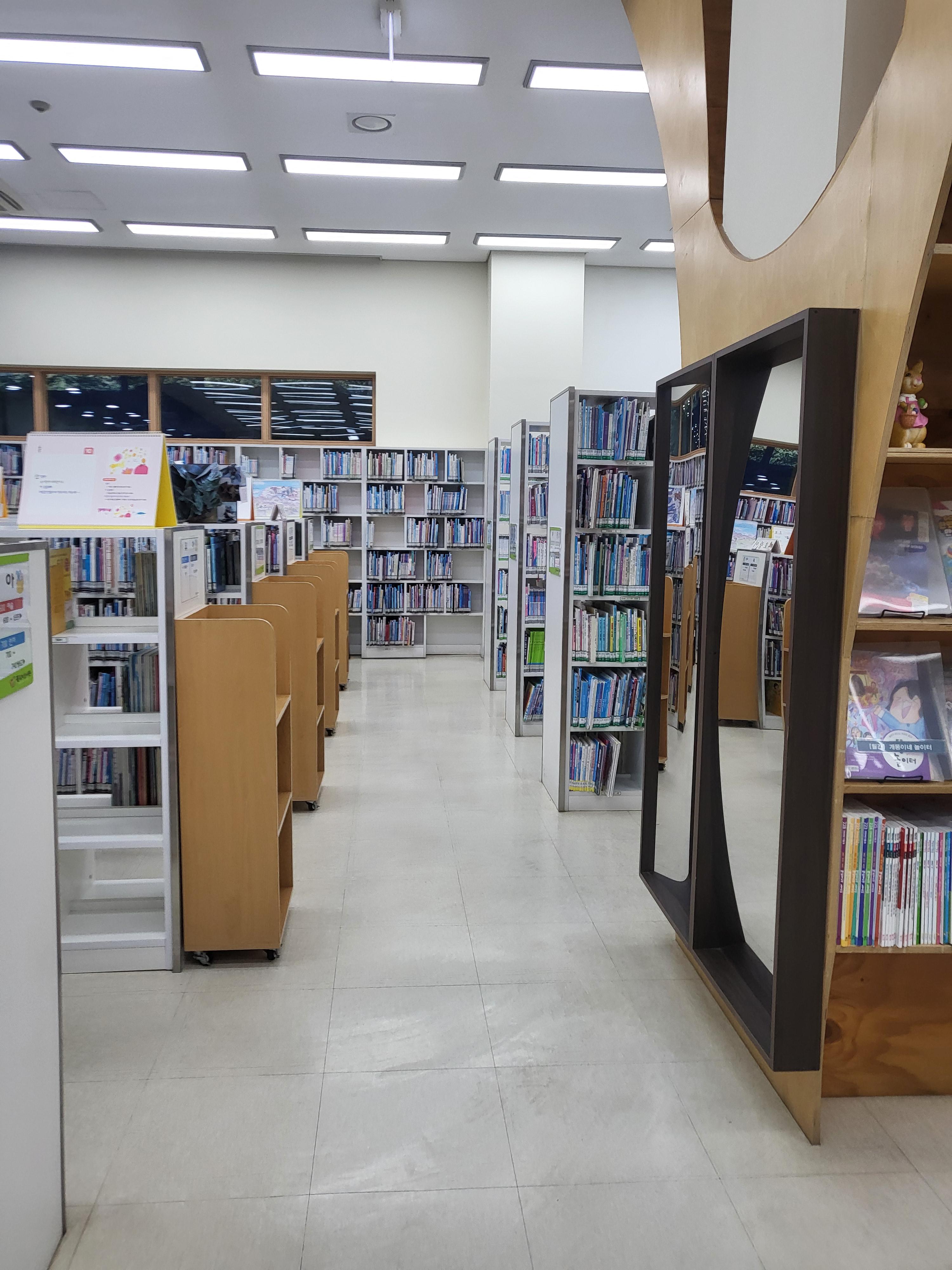 1층은 어린이 자료실, 유아열람실, 카페테리아,강의실, 전시홀 등이 있다