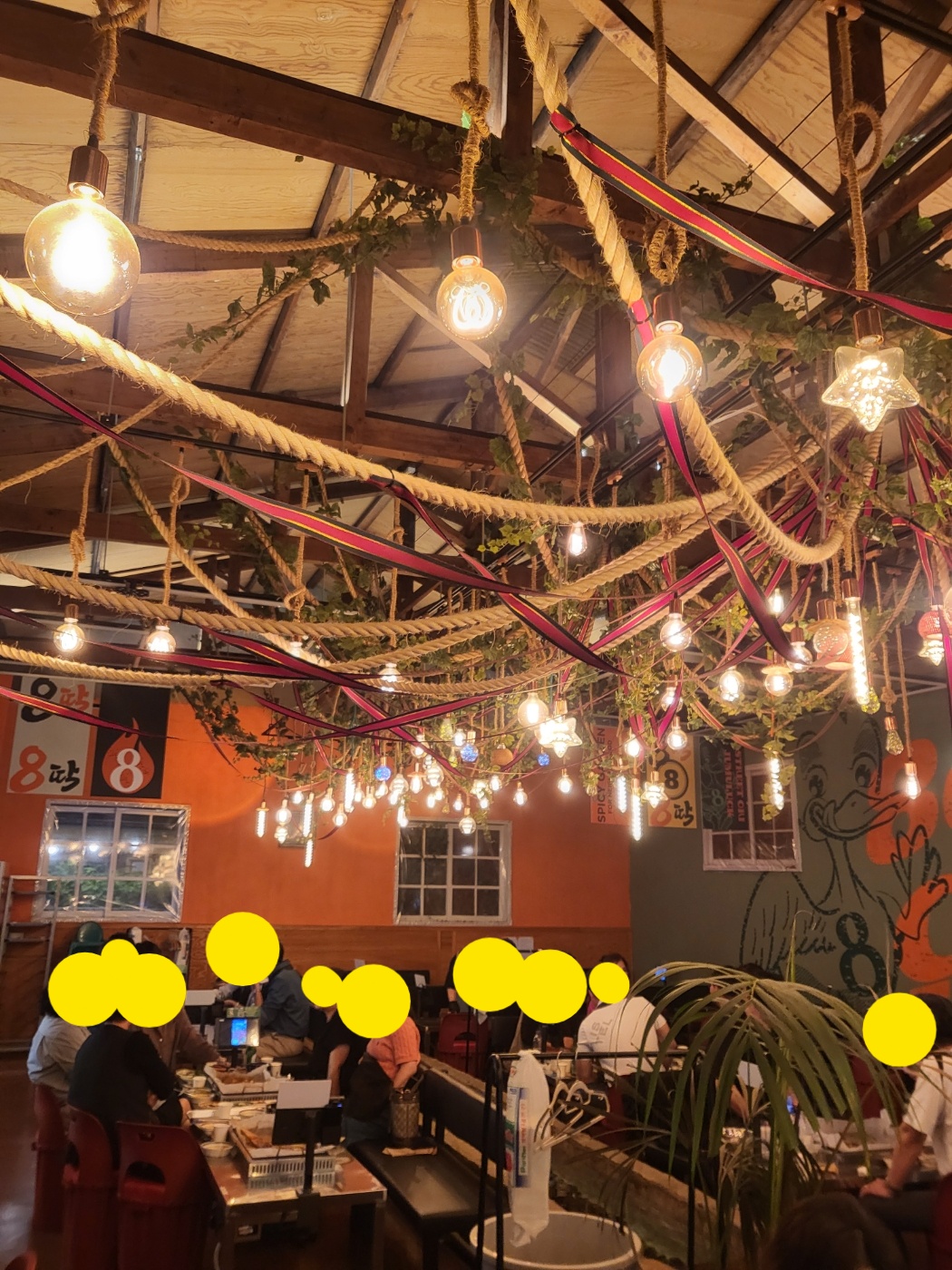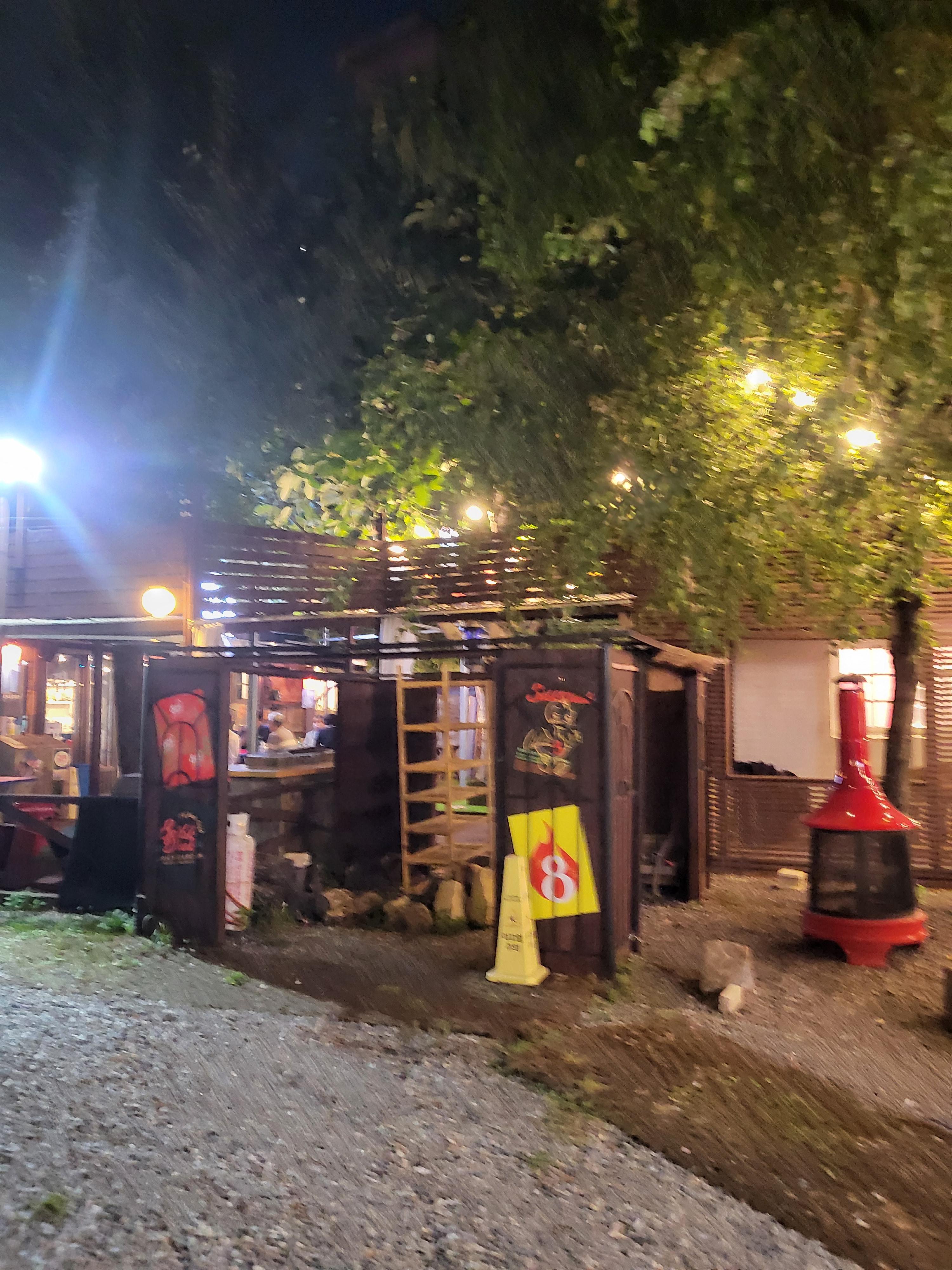 옆에 연못도 있고 밖에는 불멍하고 위에 조명은 화려하고